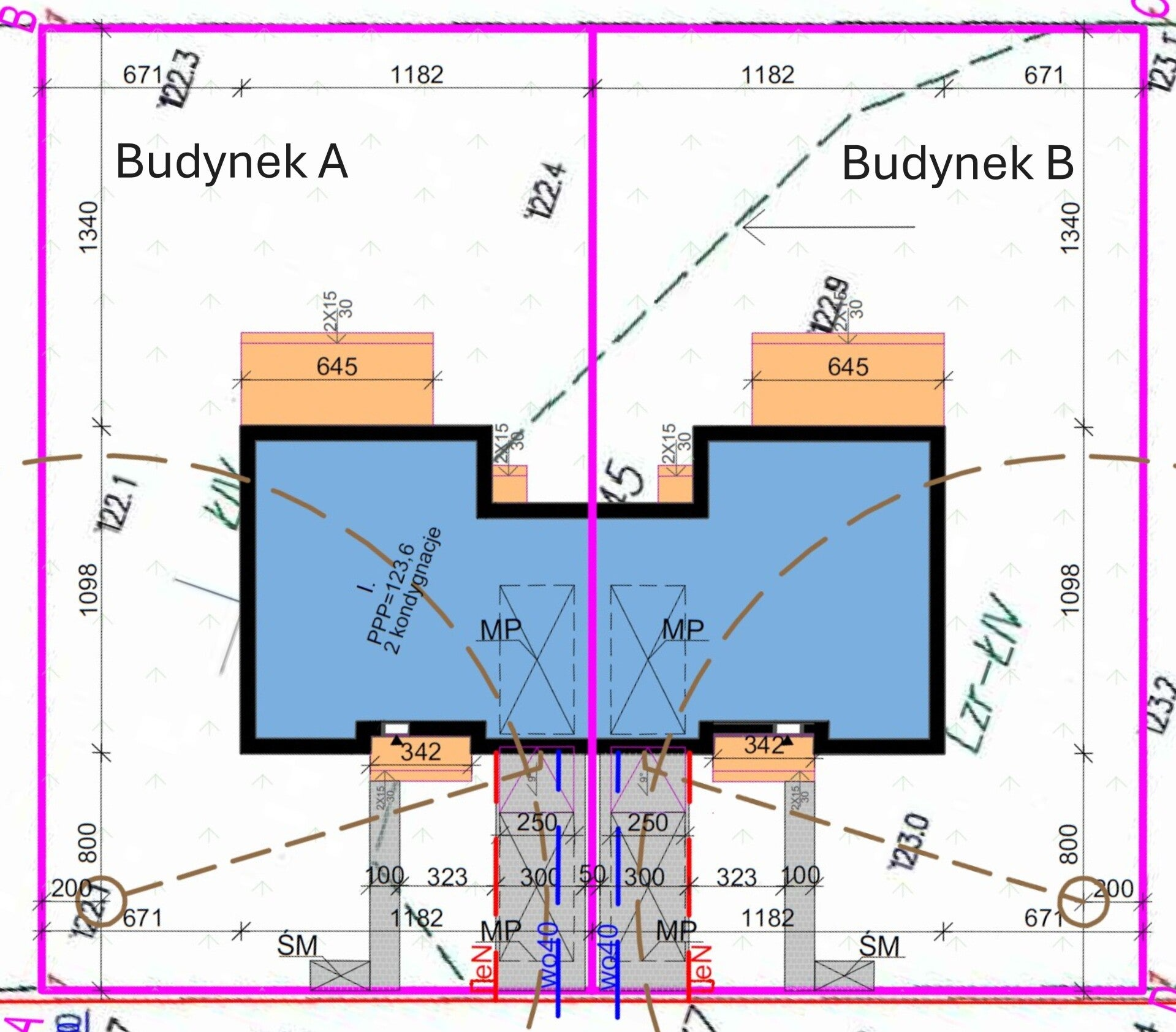 | Fundamenty | Ławy żelbetowe z betonu B20, ściany fundamentowe z bloczków betonowych B15, słupy i wieniec żelbetowy wzmacnijący ściany fundamentowe, izolacja przeciwwilgociowa pozioma papa termozgrzewalna, izolacja przeciwwilgociowaa pionowa masa Dysprobit, izolacja termiczna ścian fundamentowych styropian 15 cm, podład betonowy pod posadzkę na gruncie z betonu B15. |